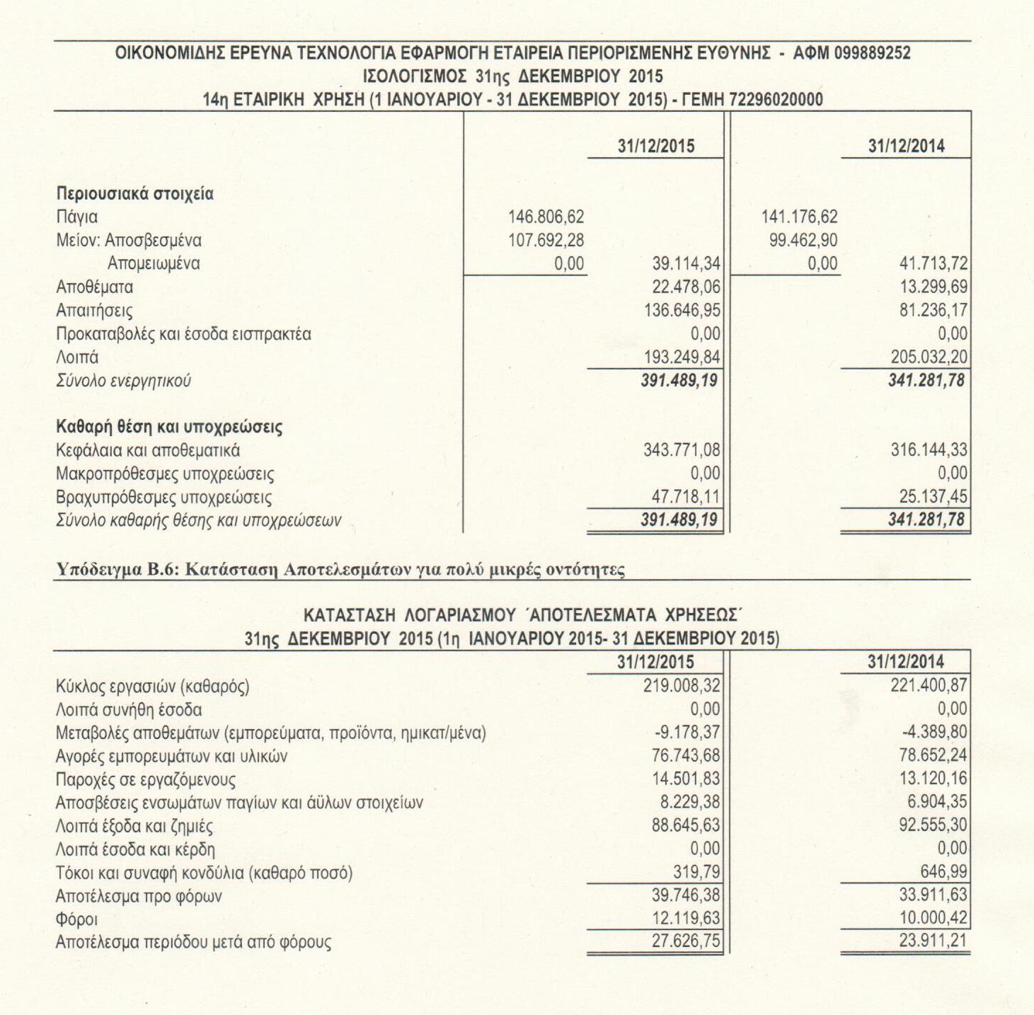 ΟΙΚΟΝΟΜΙΔΗΣ ΕΡΕΥΝΑ ΤΕΧΝΟΛΟΓΙΑ ΕΦΑΡΜΟΓΗ ΕΠΕ – ΙΣΟΛΟΓΙΣΜΟΣ 2015